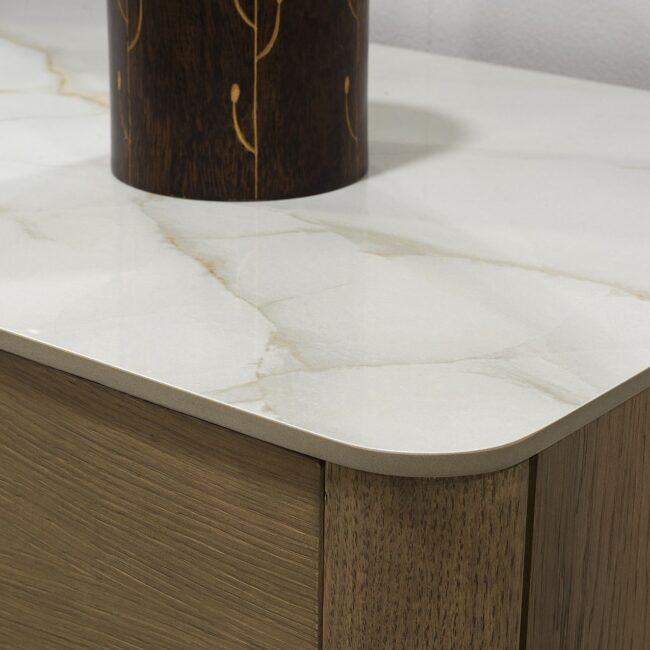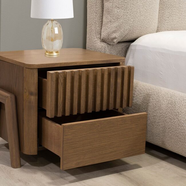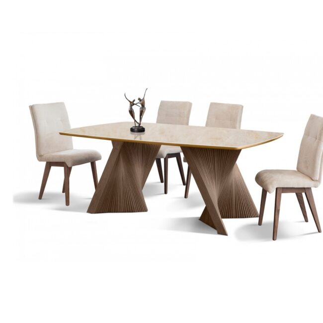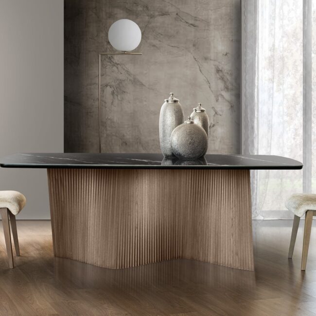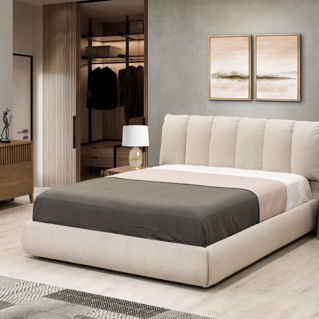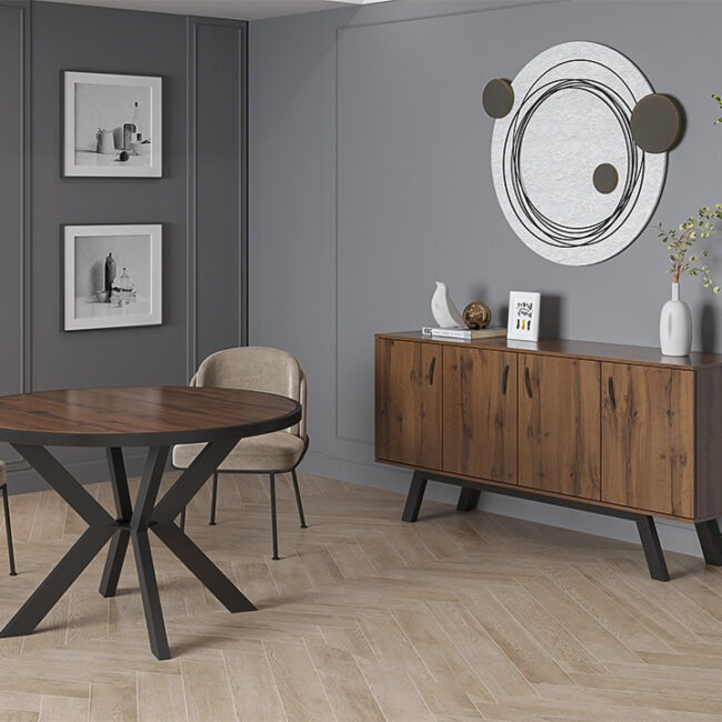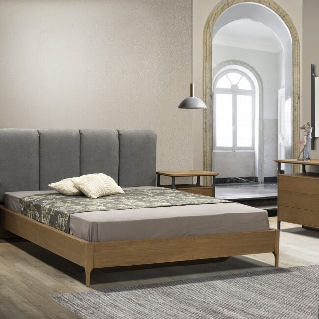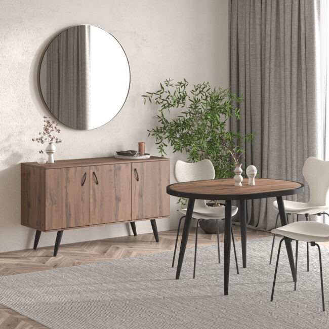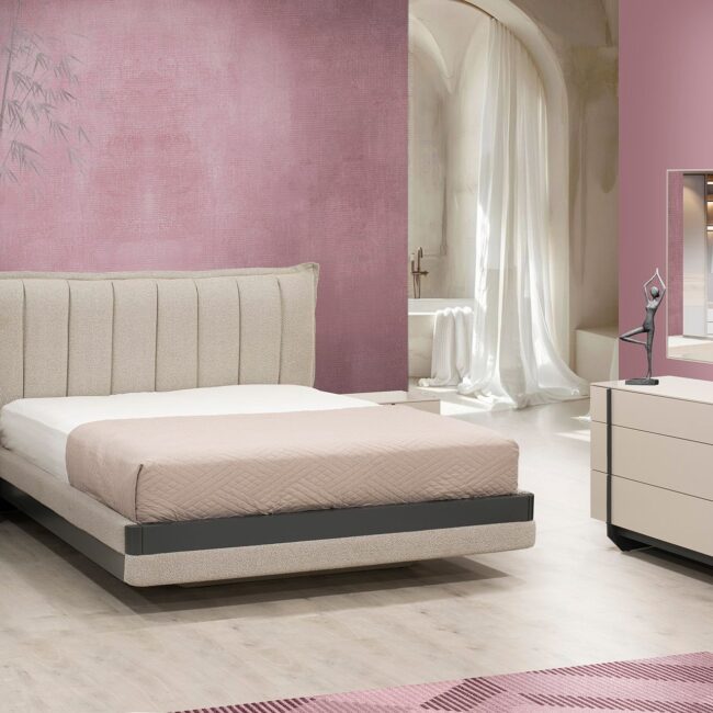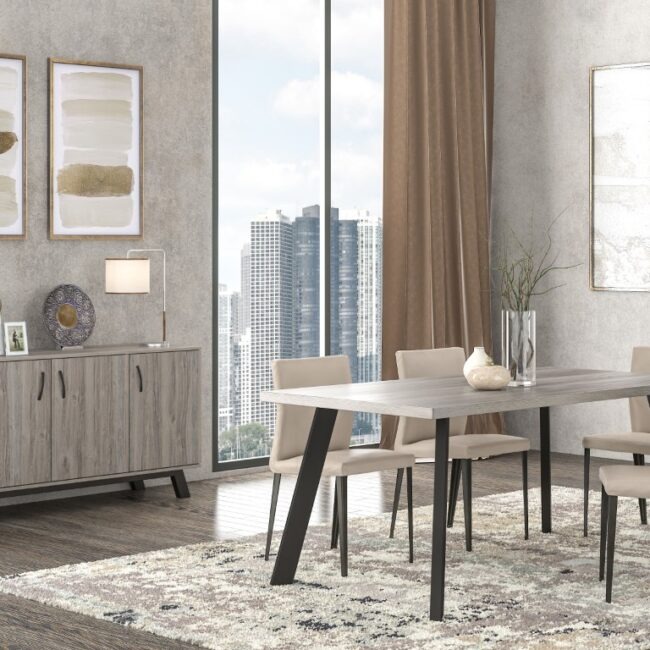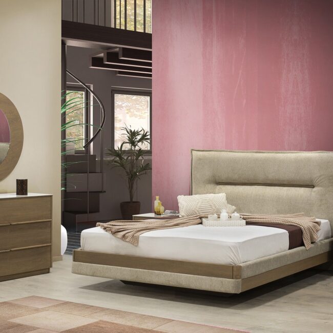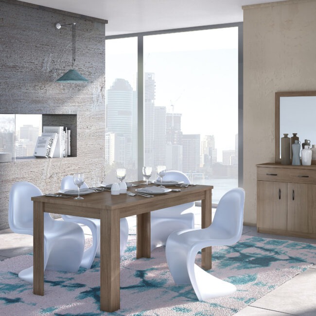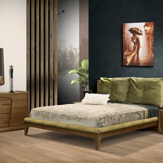 Πρόταση επίπλωσης Ελλήνων κατασκευαστών που περιλαμβάνει γωνιακό καναπέ, τραπεζάκι σαλονιού, επιτοίχια σύνθεση, τραπεζαρία με τέσσερις καρέκλες, κρεβατοκάμαρα με δύο κομοδίνα.