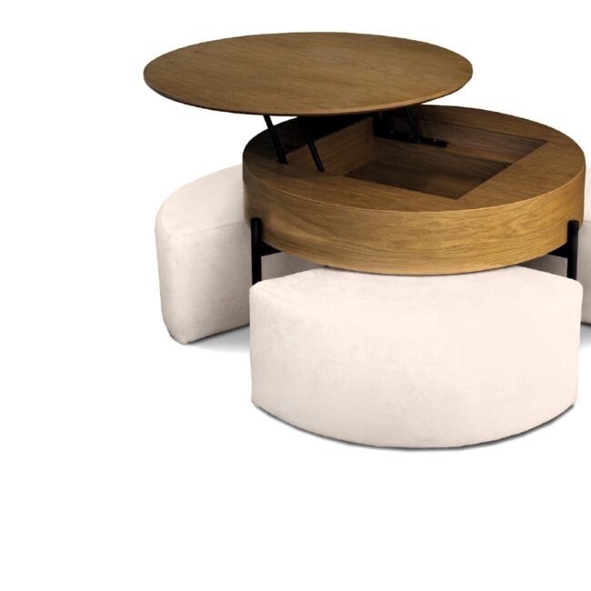 Πρόταση επίπλωσης Ελλήνων κατασκευαστών που περιλαμβάνει γωνιακό καναπέ, τραπεζάκι σαλονιού, επιτοίχια σύνθεση, τραπεζαρία με τέσσερις καρέκλες, κρεβατοκάμαρα με δύο κομοδίνα.