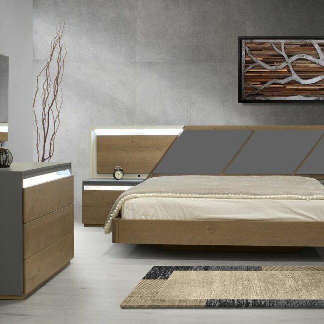 Ολοκληρωμένο σετ κρεβατοκάμαρας σε δρυς, ελληνική κατασκευή, χειροποίητη. Κρεβάτι, κομοδίνα, συρταριέρα με καθρέφτη ή εναλλακτική επιλογή ψηλής στήλης με ντουλάπι-καθρέφτη. Το κεφαλάρι είναι επενδυμένο με αδιάβροχο, αλέκιαστο, μαλακό ύφασμα. Στο πάνω μέρος είναι τοποθετημένος κρυφός φωτισμός όπως επίσης κρυφά τοποθετημένο είναι και το πόδι του κρεβατιού. Τα κομοδίνα και η συρταριέρα έχουν διακριτική λεπτομέρεια στο πλάι από ματ λάκα. Το χρώμα του ξύλου και του υφάσματος, όπως και οι διαστάσεις μπορούν να τροποποιηθούν ανάλογα με τις ανάγκες σας. Οι λεπτομέρειες στην ποιότητα κατασκευής είναι το σήμα κατατεθέν στις κάμαρες μας!
