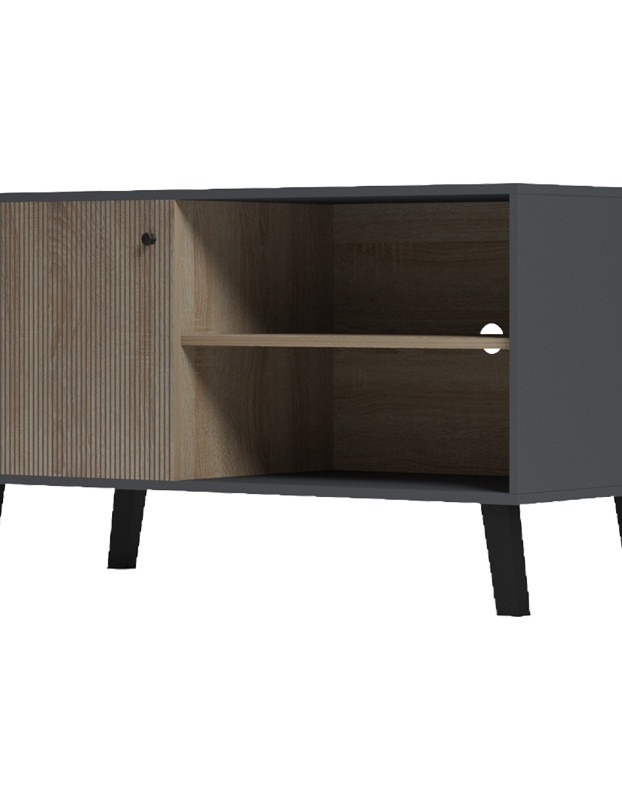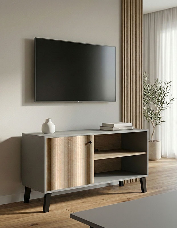 - Περιλαμβάνει ευρυχωρους κλειστούς χώρους αποθήκευσης και ανοιχτά ράφια ιδανικά να φιλοξενήσουν ηλεκτρικές συσκευές ή διακοσμητικά αντικείμενα.