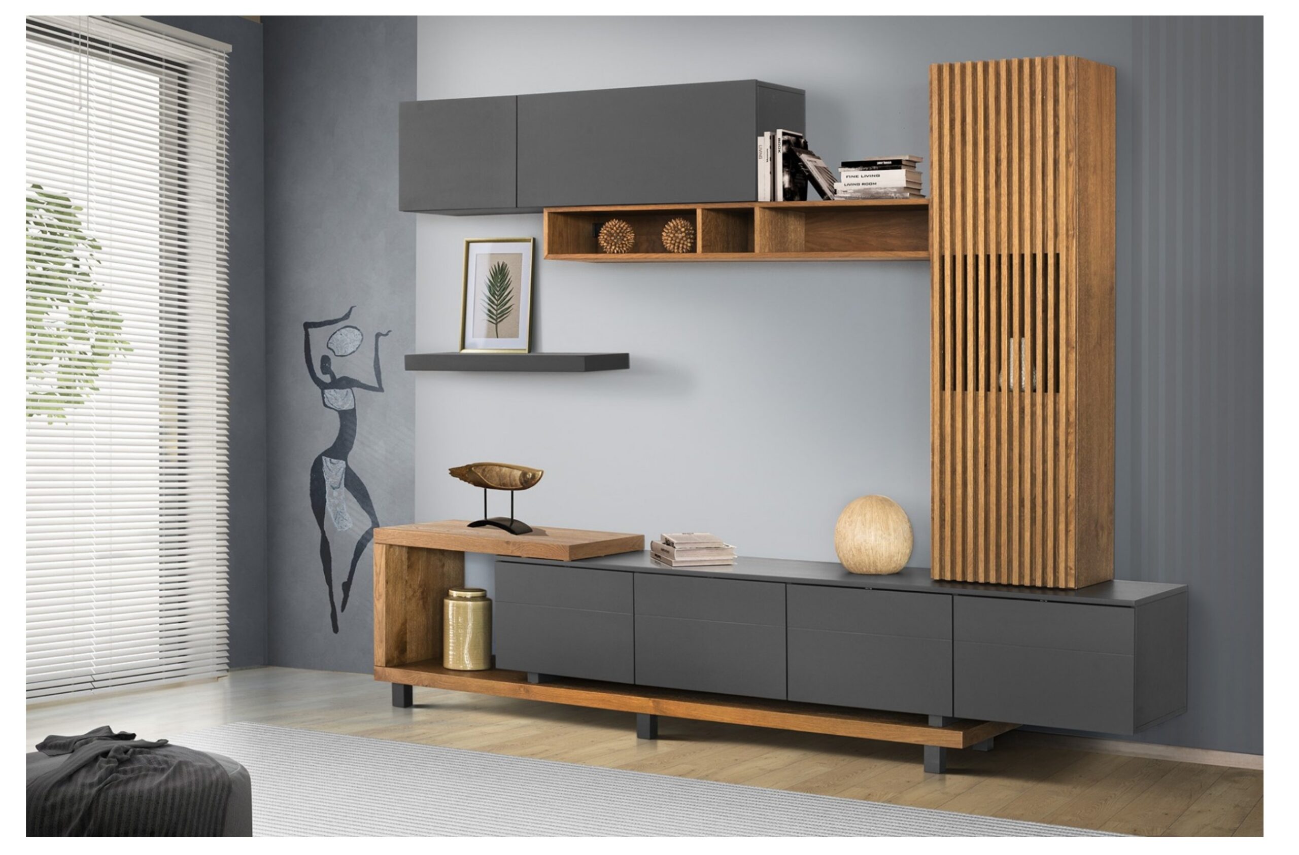 Σύνθεση σε ξύλο δρυ με στοιχεία σε μασίφ δρυ και λάκα σε διάσταση 260x45cm.